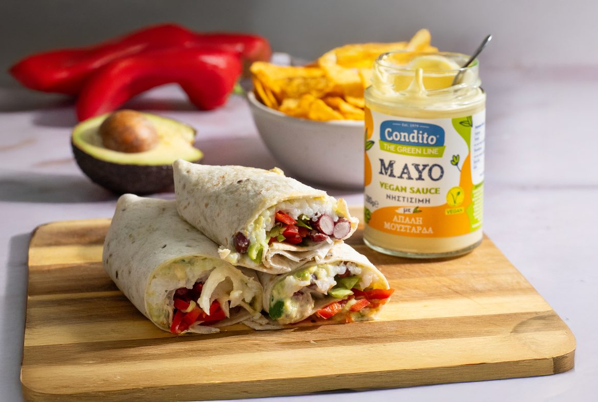 ΣΥΝΤΑΓΗVegan burito με Mayo Vegan Sauce με απαλή μουστάρδα Preparation time: 5′Cooking time: 5′ For the Mayo Guacamole 4 tbsp Vegan Mayo Sauce with mild mustard by...