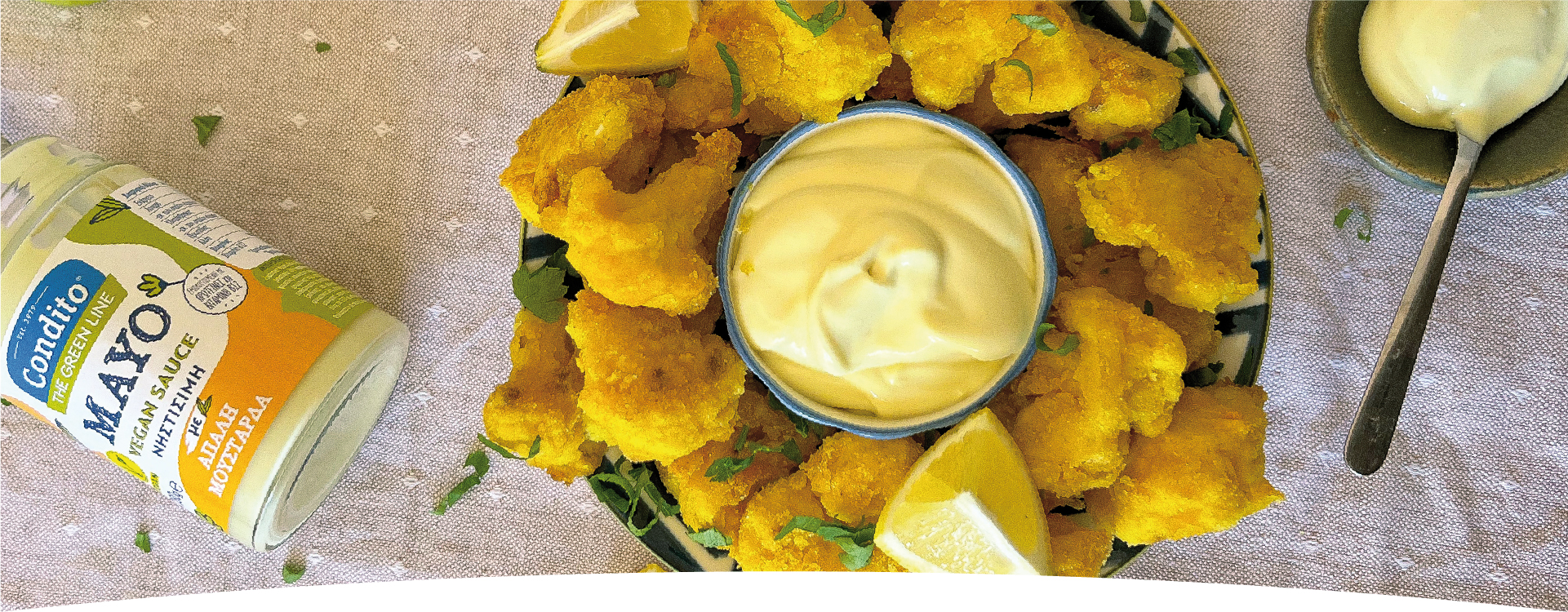 Home  |  ,   |  Crispy cauliflower nuggets and Mayo Vegan Sauce with Mild Mustard